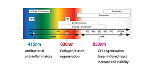 Has a wavelength as 415mm, the blue light has the effects of restraining inflammation, acne is mainly caused by an acid bacillus, the blue-light can destruct their bacteria with no injury to skin tissue, decrease acne as much as possible, decrease and cure acne during inflammation period very short time Advice for a period of treatment.