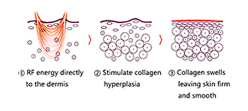 The radio waves enter the deep part of the skin, and the internal natural resistance movement causes the skin to heat up. The use of dermal collagen cellulose immediately produces a contraction principle at 45~60℃, which can smooth wrinkles, tighten the skin, and delay skin aging.